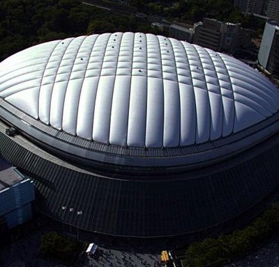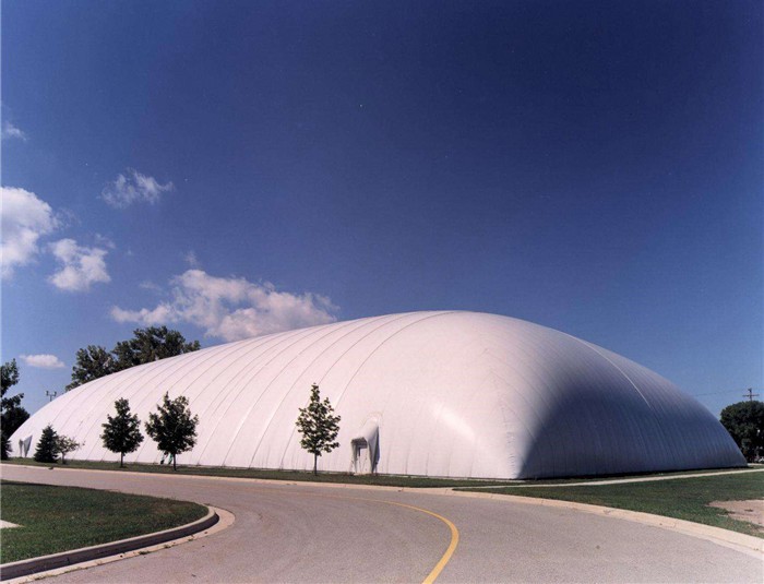 氣膜結(jié)構(gòu)由于只承受張力,可使材料受力性能得到充分發(fā)揮,加之其獨(dú)特的性能特點(diǎn)和優(yōu)勢(shì),當(dāng)前已越來(lái)越廣泛地應(yīng)用于大跨度結(jié)構(gòu)建筑中。它以優(yōu)良的織物為材料,由膜內(nèi)空氣壓力支承膜面,或利用柔性鋼索、剛性支撐結(jié)構(gòu)通過(guò)彎曲內(nèi)面力傳送,將膜面繃緊,從而形成具有一定剛度、張力,能夠覆蓋大跨度空間的膜結(jié)構(gòu)體系。