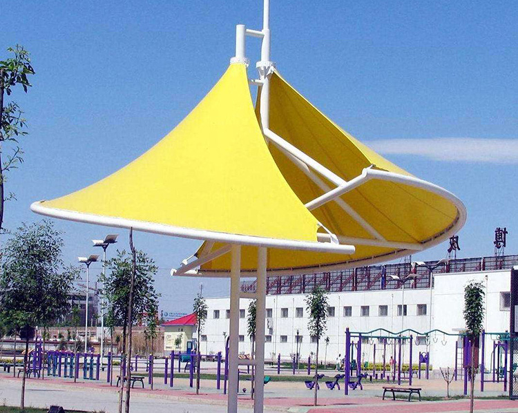 由于膜材料本身應(yīng)有的顯色性,在夜間彩燈的映射下能形成絢麗繽紛的景觀,不僅為人們提供遮陽(yáng)避雨的空間。同時(shí),更由于這種生動(dòng)活潑的造型能給人們帶來(lái)時(shí)尚、輕松的休閑感受,所以廣受歡迎。